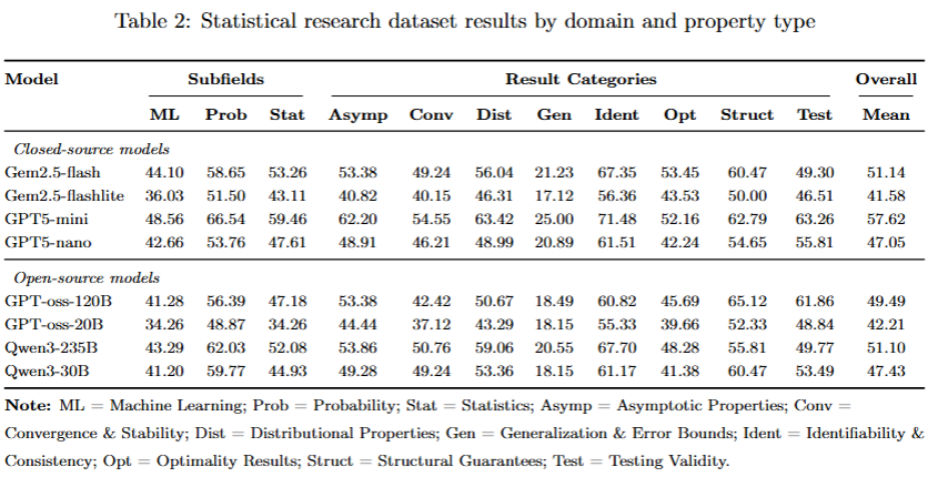 在研究级数据集上,相较于基础数据集,大模型的总体表现都呈现了显著的下降趋势,不同模型在复杂推理任务中的差距进一步扩大。闭源模型,尤其是GPT-5系列,在所有子领域及理论性质任务中均保持领先地位。其中,GPT5-mini及其优化版本的综合得分接近60分,展现出初步合格的高阶推理与理论验证能力。相比之下,开源模型如Qwen等整体表现较弱,但在概率与分布性质相关任务中显示出一定潜力。