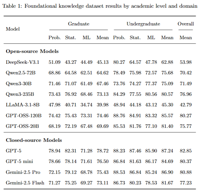 在基础知识数据集上,各类大语言模型在本科与研究生两个层面均表现出明显差异。总体来看,闭源模型在各学科方向上均显著优于开源模型,其中GPT-5以平均分82.85 位居首位,展现出最强的综合统计推理能力。开源阵营中,Qwen3-235B 取得76.96的整体均分,逐渐缩小与闭源模型的差距,而 LLaMA-3.1-8B 与 DeepSeek-V3.1 等模型整体表现偏弱,说明模型规模、训练优化与统计教育领域适配性仍是影响基础推理表现的关键因素。