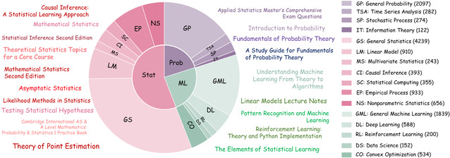 基础知识数据集共包含 13,817 道题目,系统覆盖从本科到研究生阶段的统计核心内容,涵盖概率论、统计学和机器学习三大领域及多个子方向。数据集包含1,517道选择题以及 12,300道开放式问答题,包括计算、简答以及证明题目。题目主要来自:(1)45本经典教材,覆盖完整课程体系;(2)千余道经过人工核验的研究生入学考试与精选习题;(3)国际一流大学公开课程与优质在线公开资源。
